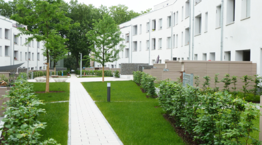 In den Außenanlagen der Liebighöfe gibt es neben den Mietergärten halb-öffentliche Bereiche, die dem nachbarschaftlichen Zusammenleben einen Raum geben. Verschiedene Sitzmöglichkeiten und ein kleiner Spielpunkt sorgen für die ruhige Belebung der gemeinschaftlichen Bereiche.