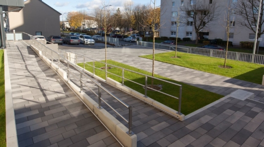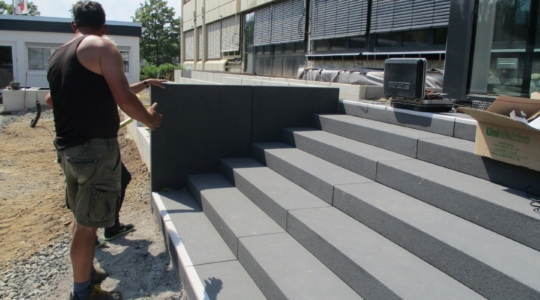 Die komplexe Außenanlage des Gießener Rechenzentrums nimmt langsam Form an. Neben diversen Sonderbauteilen und Stufen wurden bereits die Mauerwinkel für die barrierefreie Erschließung gestellt.