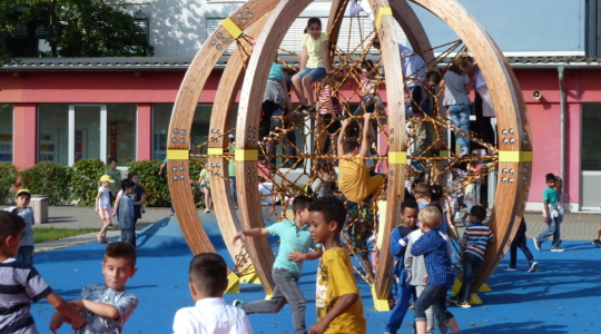 Der neue Schulhof in Raunheim wurde begeistert von den Schülern aufgenommen! Metallpergola, Kletterglobus und fugenloser Fallschutz bilden farbige Highlights auf der neuen Pausenfläche.