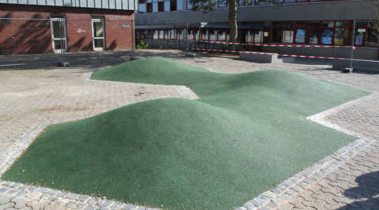 Mit der Abnahme des farbigen Spielbelages auf den Hügeln ist der nächste Teilbereich aus dem Masterplan fertiggestellt. Die Schüler können ab dem 01.06. die neuen Flächen einweihen.