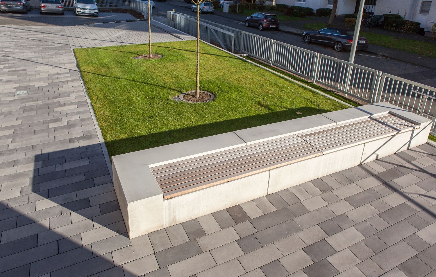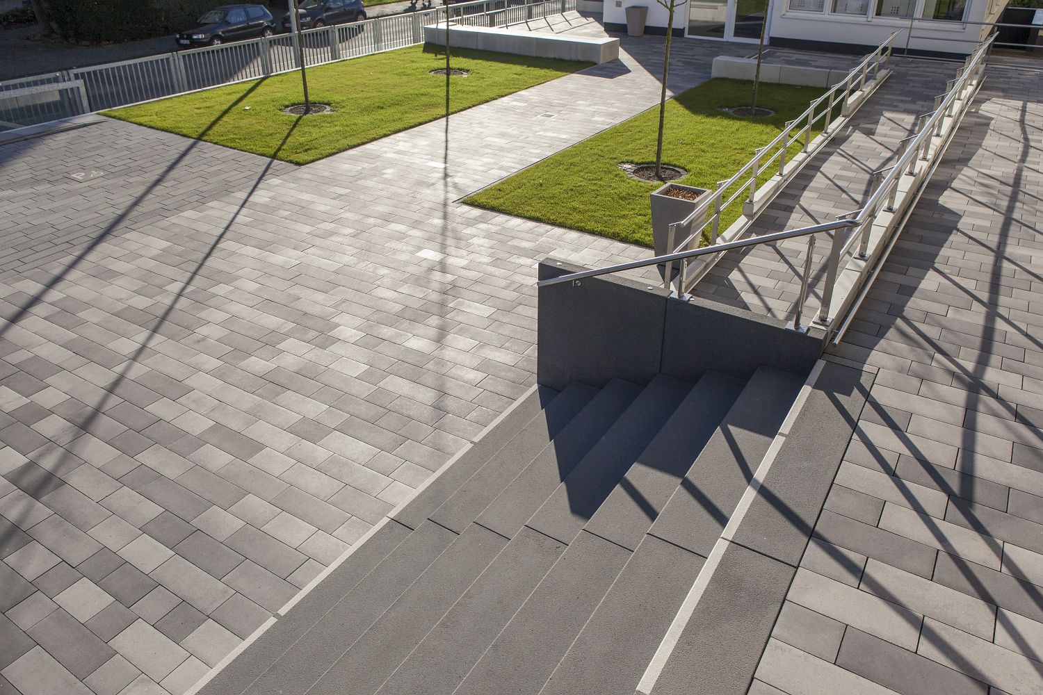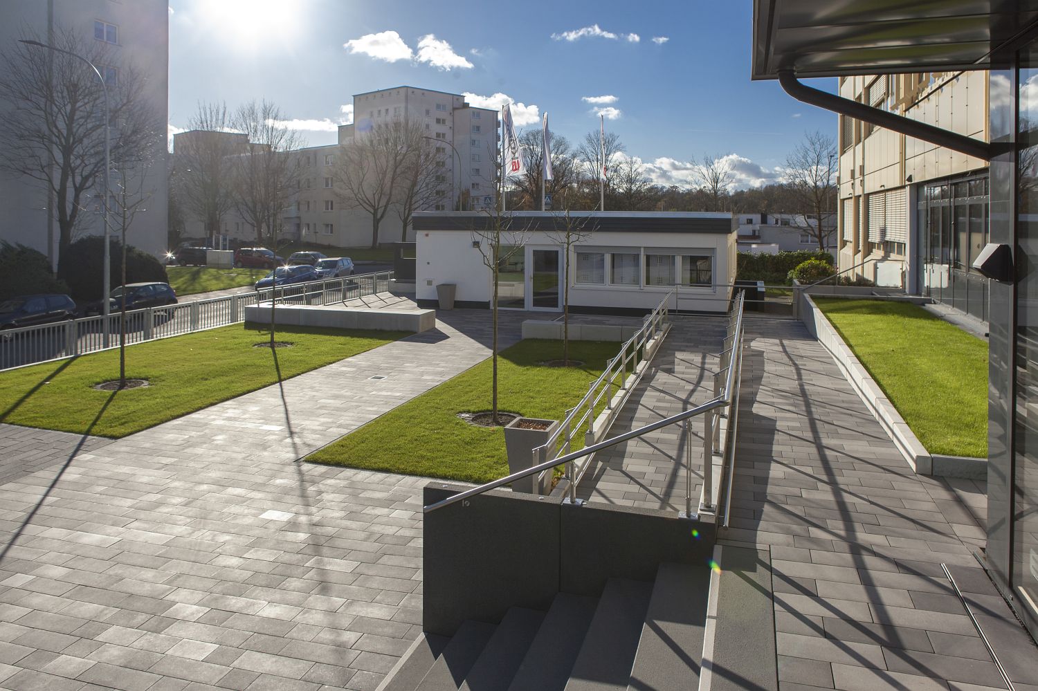 Die Verlegung des Haupteingangs gab den Anstoß, Parkplatz und Eingangsbereich des kommunalen Gebietsrechenzentrums zu überarbeiten. Die alten Waschbetonmauern wichen einer offenen Gestaltung mit klaren Linien und hoher Transparenz. Eingefasst in die barrierefreie Erschließung, schaffen die Rasenflächen im Zentrum der Außenanlagen eine neue Aufenthaltsqualität. Sonderbauteile aus Beton und Holz dienen nicht nur als Sitzelemente, sondern auch als raumbildender Blickfang. Durch das melierte Pflaster wirken die befestigten Flächen weniger dominant. Entstanden ist ein repräsentativer Eingangsbereich der die verschiedenen Anforderungen an Stellflächen, Erschließung und Aufenthaltsräumen harmonisch zusammenführt.