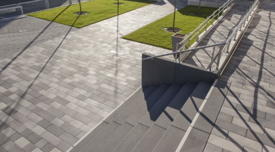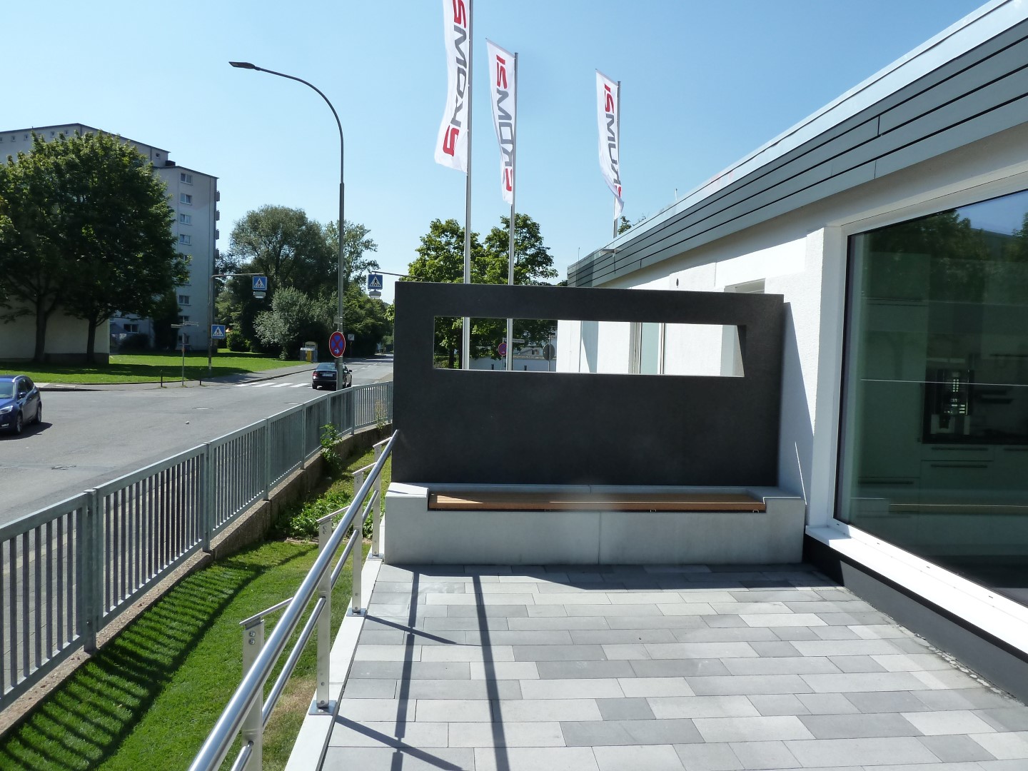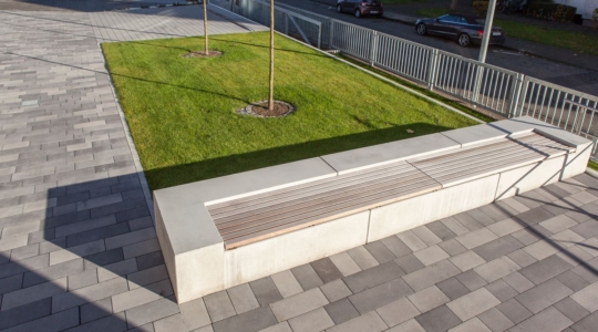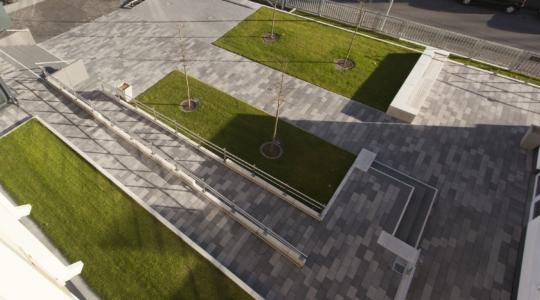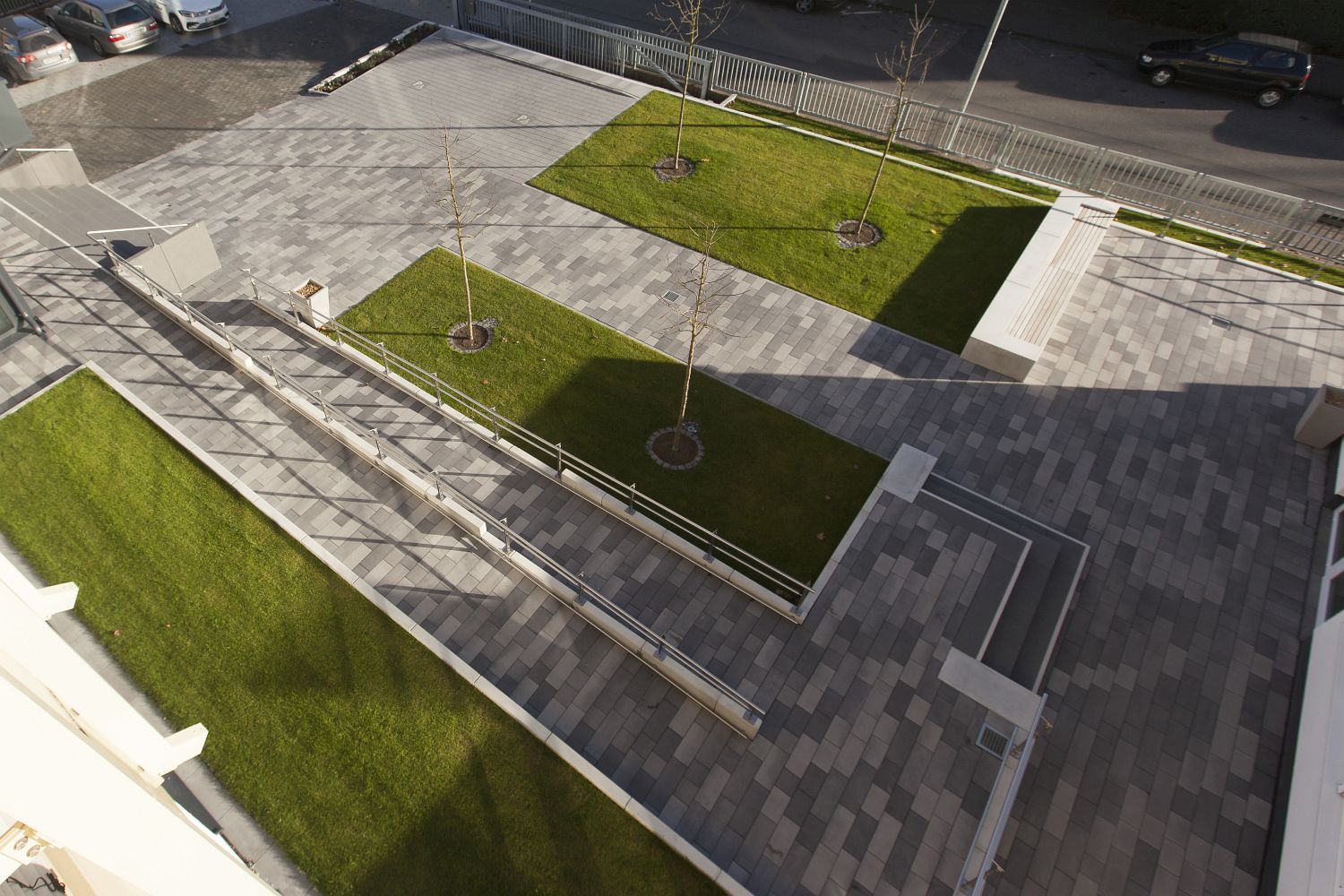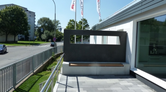 Die Verlegung des Haupteingangs gab den Anstoß, Parkplatz und Eingangsbereich des kommunalen Gebietsrechenzentrums zu überarbeiten. Die alten Waschbetonmauern wichen einer offenen Gestaltung mit klaren Linien und hoher Transparenz. Eingefasst in die barrierefreie Erschließung, schaffen die Rasenflächen im Zentrum der Außenanlagen eine neue Aufenthaltsqualität. Sonderbauteile aus Beton und Holz dienen nicht nur als Sitzelemente, sondern auch als raumbildender Blickfang. Durch das melierte Pflaster wirken die befestigten Flächen weniger dominant. Entstanden ist ein repräsentativer Eingangsbereich der die verschiedenen Anforderungen an Stellflächen, Erschließung und Aufenthaltsräumen harmonisch zusammenführt.