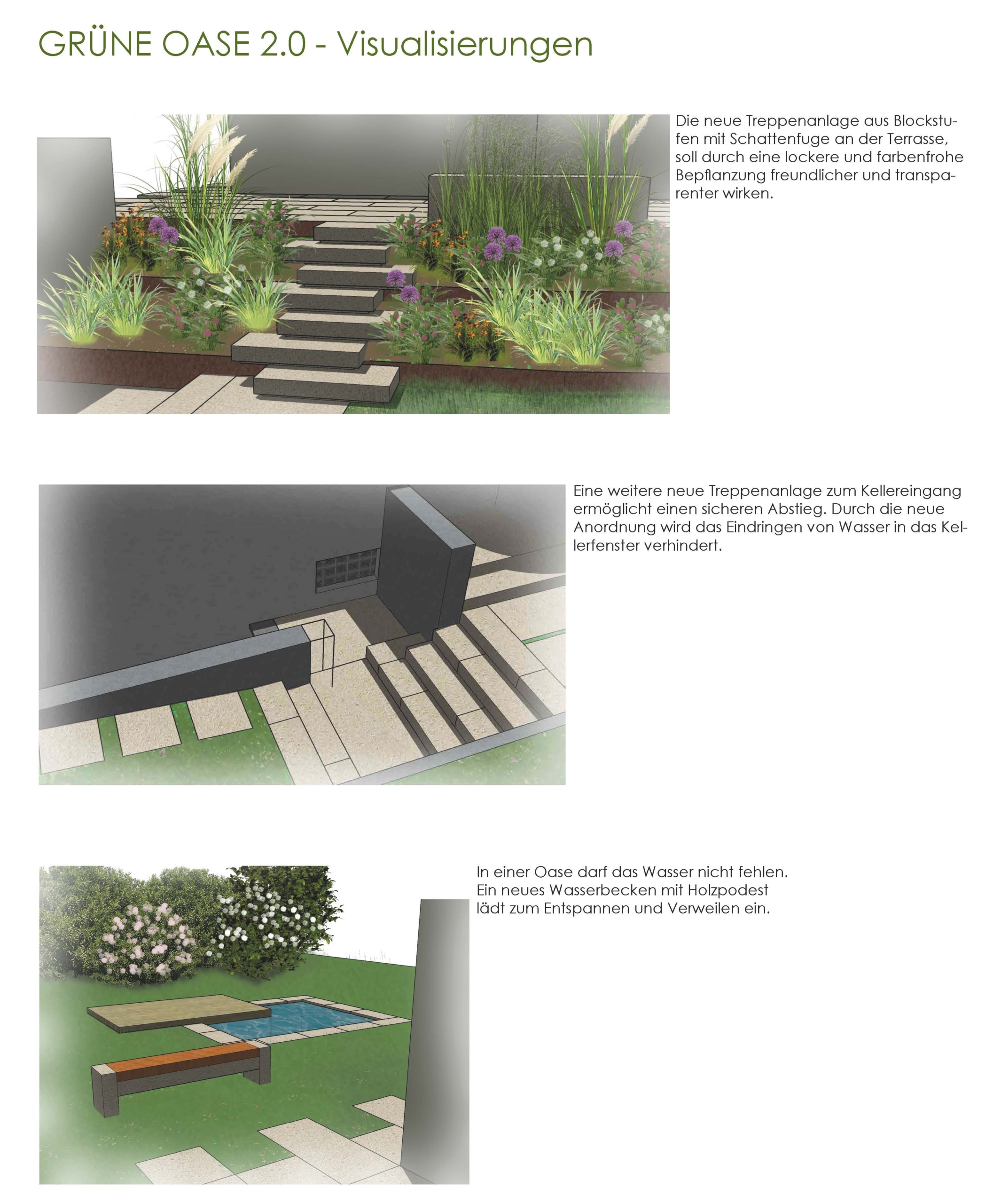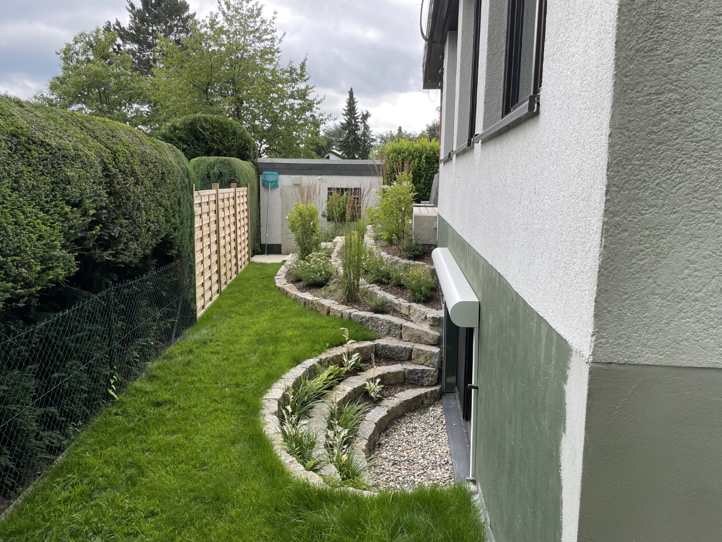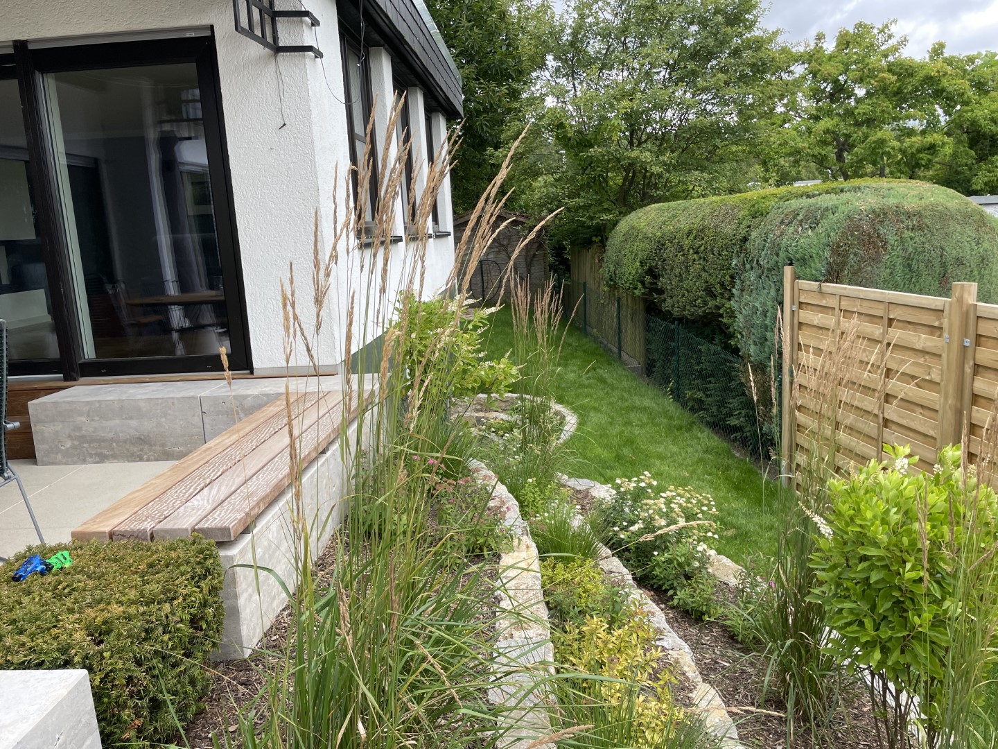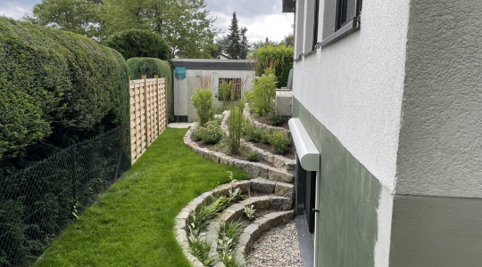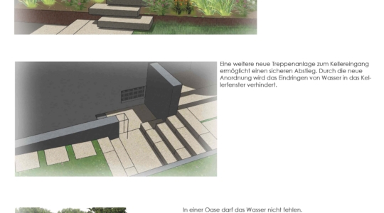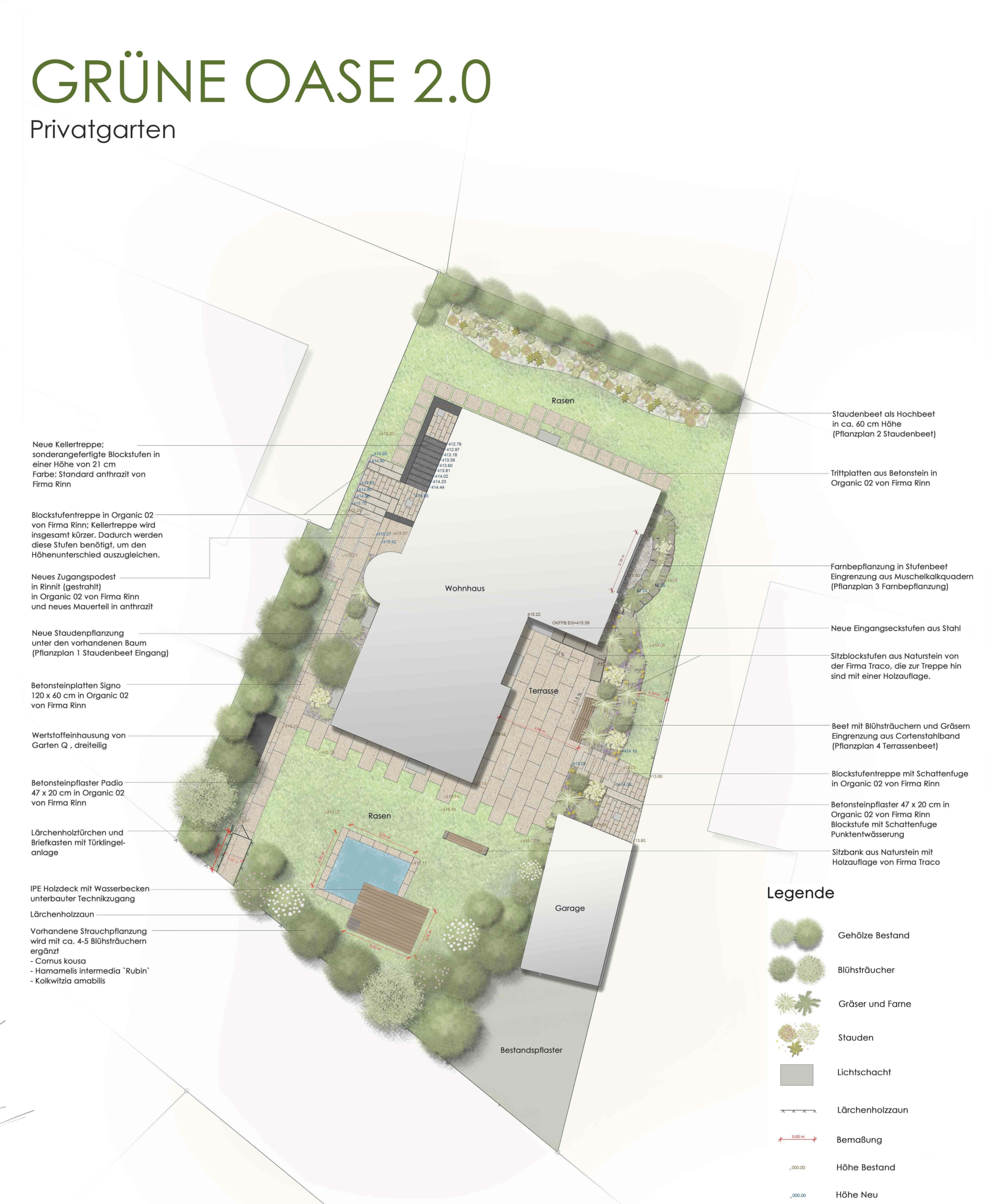 In dem Privatgarten sollen neben neuen Wünschen auch alte Bedürfnisse umgesetzt werden. Während um das Haus herum neue Plattenbeläge für Sauberkeit und Harmonie sorgen, wird mit Pflanzen die Topografie gestaltet: von Staudenhochbeet über Farngarten bis hin zu Blühsträucher- und Gräserpflanzungen werden rund ums Haus die verschiedenen Standorte nach ihrem Lichtbedarf belebt. Zwischen den Beeten „schwebende“ Stufen führen von der Terrasse in den unteren Gartenbereich. Auf der anderen Seite des Hauses wir mit einer geschickten Neuanlage der steilen Kellertreppe deren Nutzung vereinfacht und sicherer gemacht. Im vorderen Garten schließlich sorgt ein Tauchbecken mit Holzdeck für Abkühlung und Erholung. Sitzbänke aus Naturstein unterstreichen die Hochwertigkeit der Anlage.