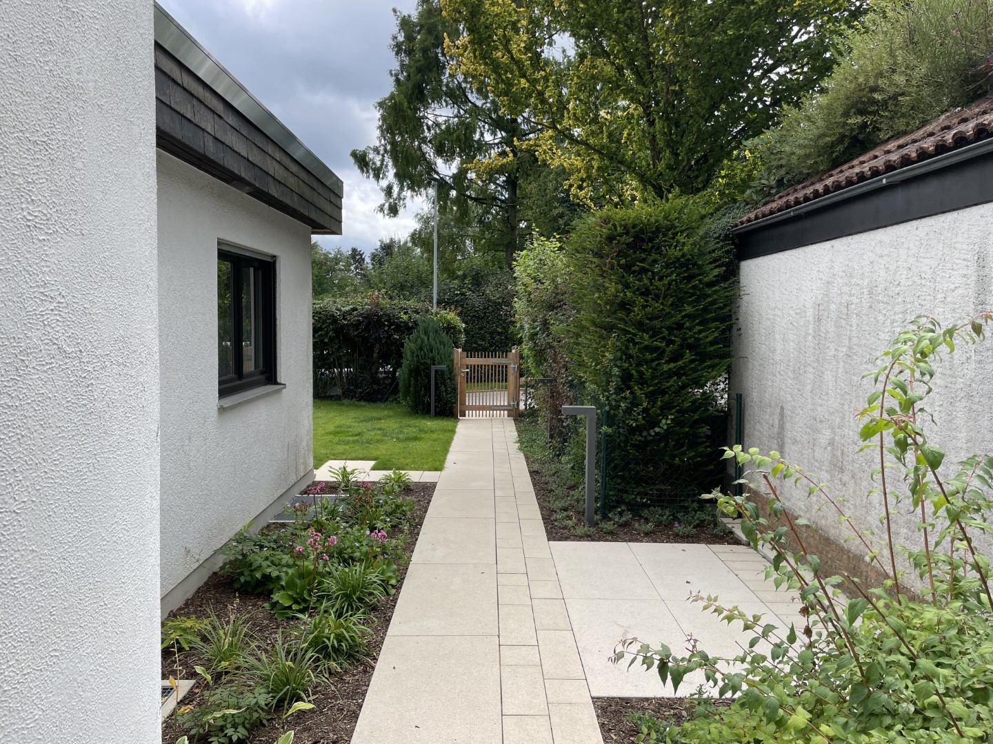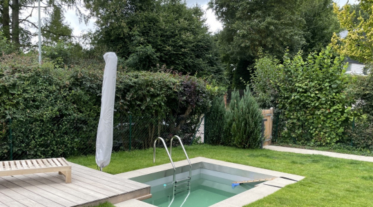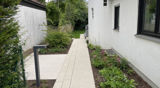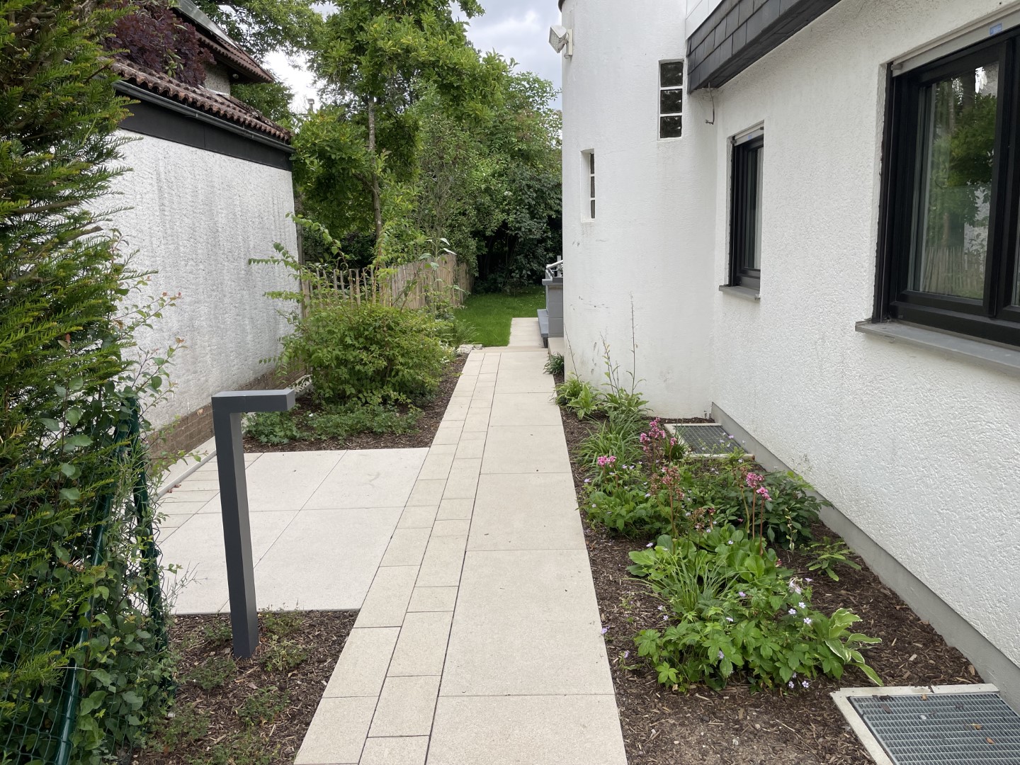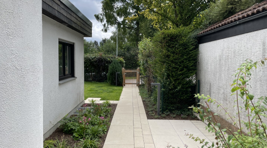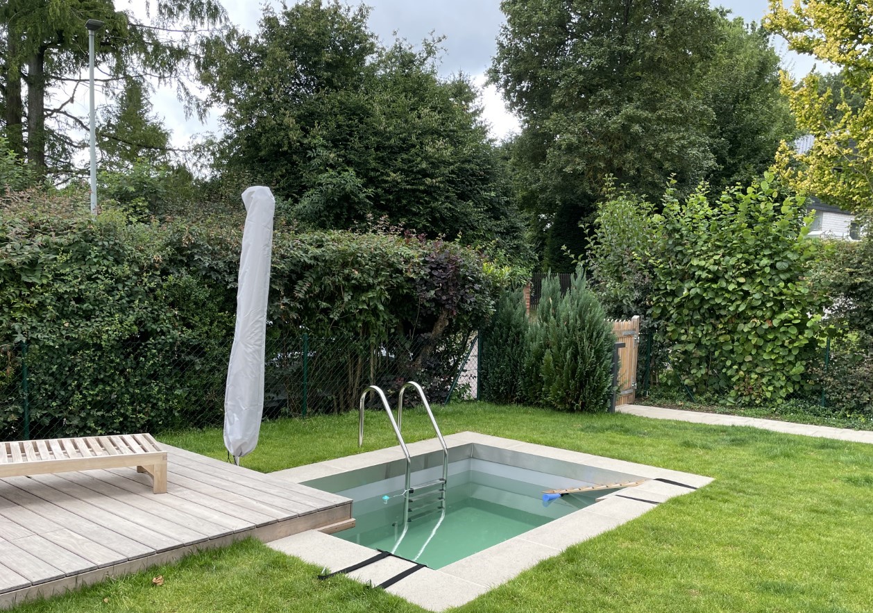 In dem Privatgarten sollen neben neuen Wünschen auch alte Bedürfnisse umgesetzt werden. Während um das Haus herum neue Plattenbeläge für Sauberkeit und Harmonie sorgen, wird mit Pflanzen die Topografie gestaltet: von Staudenhochbeet über Farngarten bis hin zu Blühsträucher- und Gräserpflanzungen werden rund ums Haus die verschiedenen Standorte nach ihrem Lichtbedarf belebt. Zwischen den Beeten „schwebende“ Stufen führen von der Terrasse in den unteren Gartenbereich. Auf der anderen Seite des Hauses wir mit einer geschickten Neuanlage der steilen Kellertreppe deren Nutzung vereinfacht und sicherer gemacht. Im vorderen Garten schließlich sorgt ein Tauchbecken mit Holzdeck für Abkühlung und Erholung. Sitzbänke aus Naturstein unterstreichen die Hochwertigkeit der Anlage.