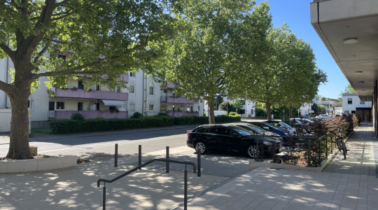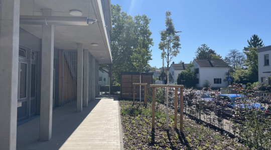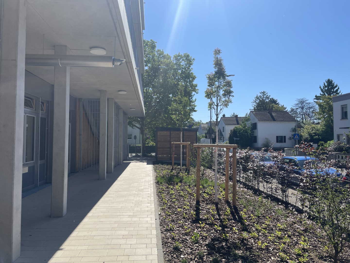 Mit dem Neubau des Klassentraktes werden Eingangsbereich und Pausenhof der Grundschule vollständig umgestaltet. Die Verschiebung des Baukörpers ermöglicht es, die Stellplätze unter den Bäumen zu versetzen. Offene Baumscheiben und Rasenkammersteine verbessern langfristig die Situation für die alten Platanen. Der neue Eingangsbereich wird breit angelegt, mit Treppen- und Rampenanlage, Sitzmauer und Staudenbeet. Die offene Gestaltung ist auf einen freundlichen Empfang ausgelegt. Hinter dem Gebäude schließt der neue Pausenhof an die Bestandsflächen an. Die große Pflasterfläche wird mit farbigen Akzenten im Belag strukturiert. Neben einem Schulhof-Baum an der Mensa und einem Schulgarten sorgt die offene Spielfläche mit Findlingen und Weiden als grünes Spielangebot für Abwechslung.