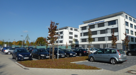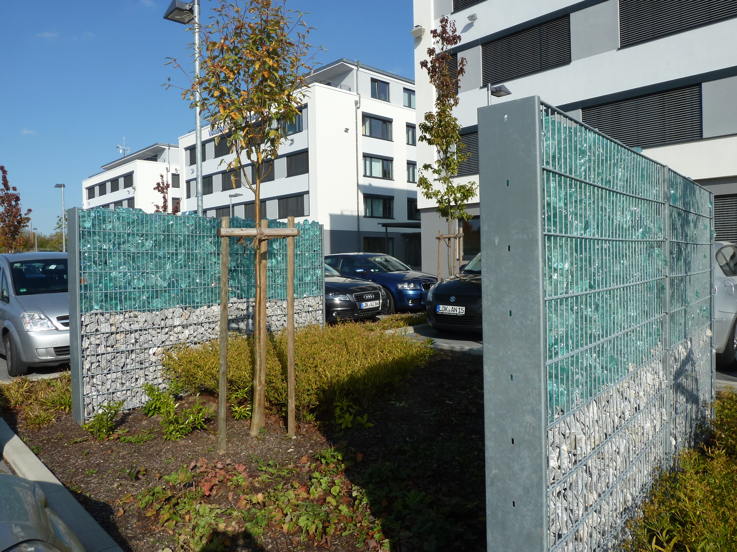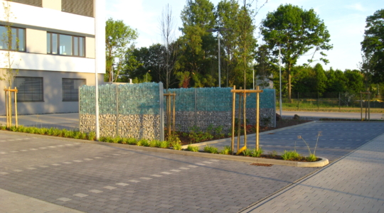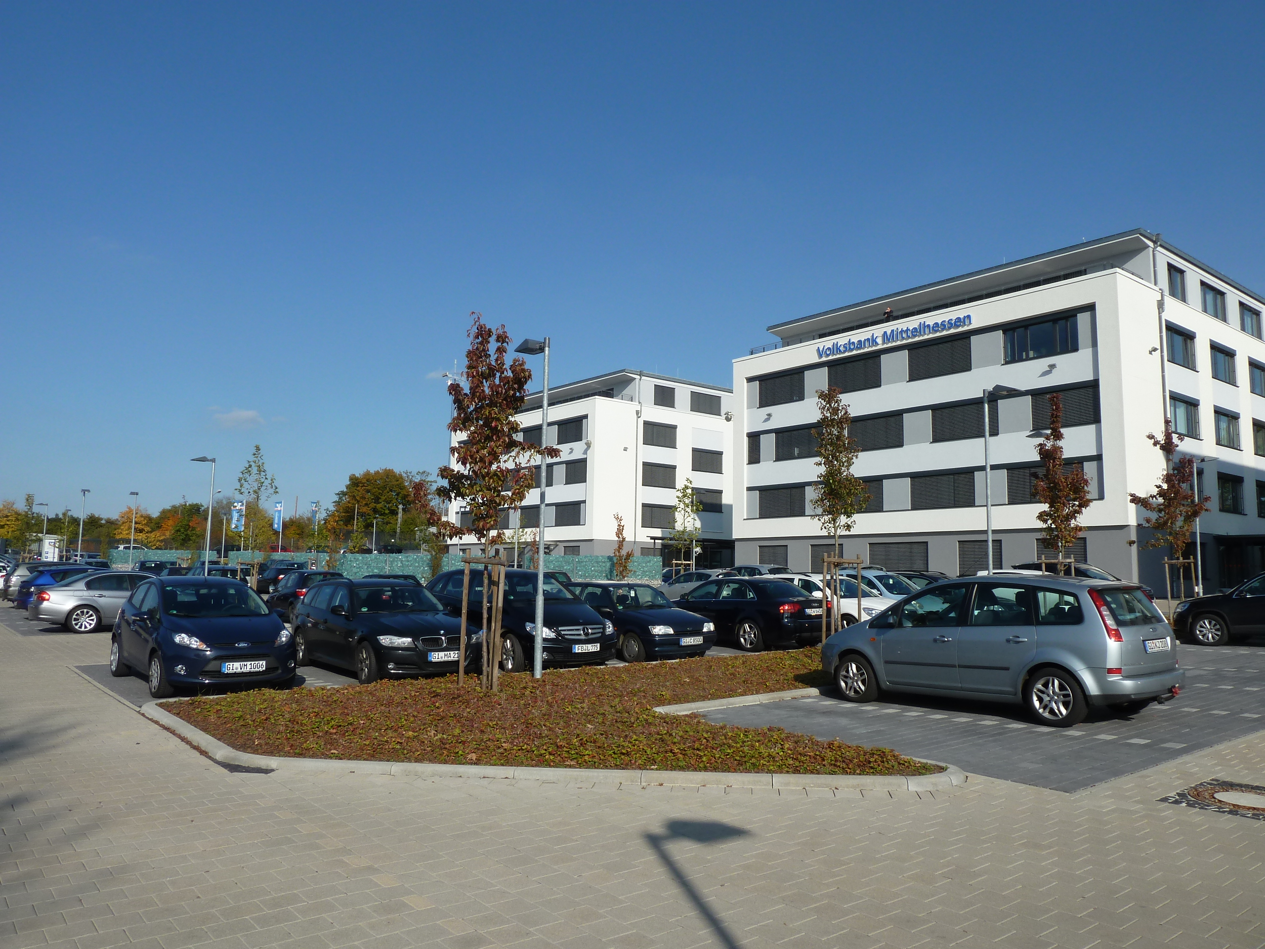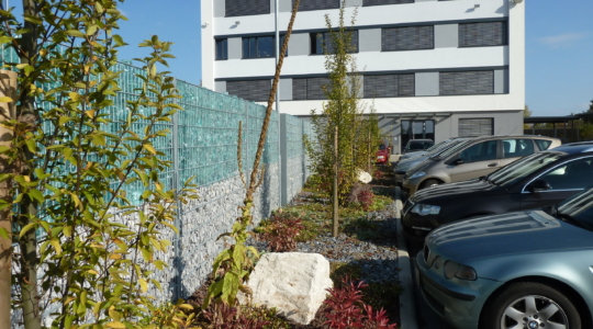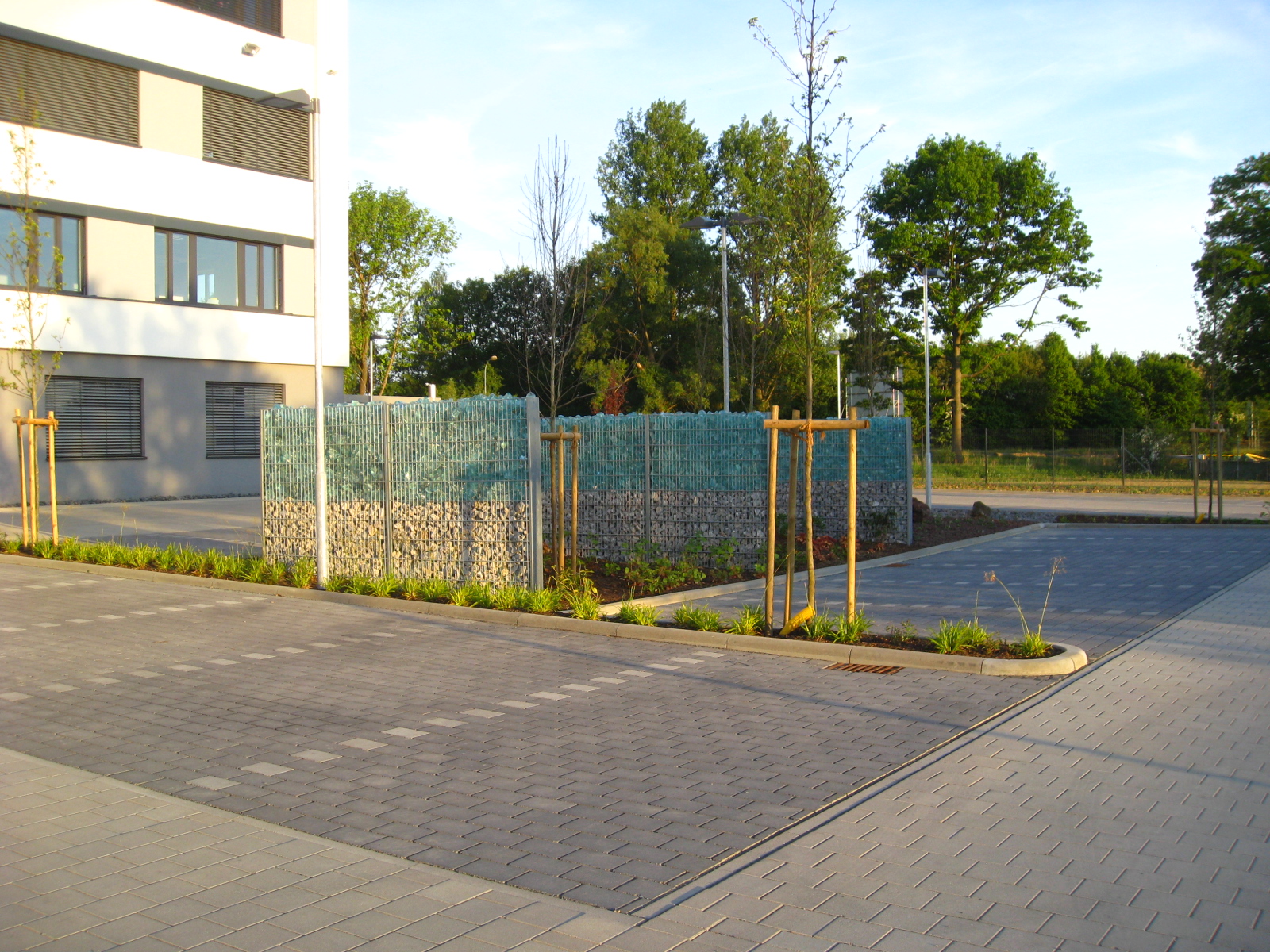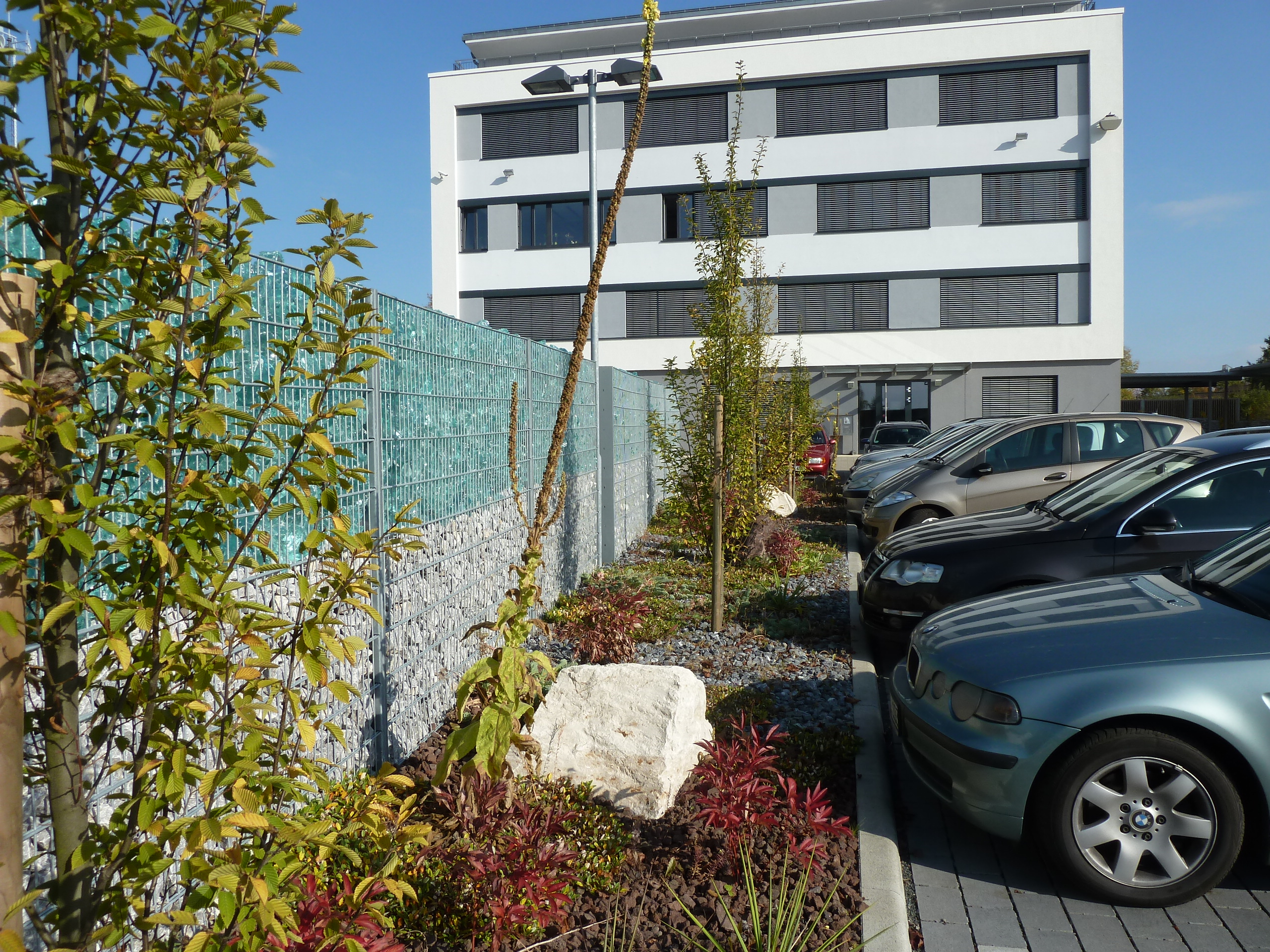 Die Verwaltungszentrale der Volksbank befindet sich in exponierter Lage am Stadteingang. Die drei kubischen Gebäude werden nach Sonnenuntergang in blaues Licht getaucht. Die Gestaltung der Freiflächen nimmt diese Eigenschaften wieder auf: Der gesamte Parkplatz wird mit Gabionenzäunen in Ost-West-Richtung strukturiert. Gefüllt sind sie mit blauem Glasbruch, der bei Lichteinfall in verschiedenen Farbnuancen aufleuchtet. Durch die Ausrichtung entstehen vor und hinter den Gabionen Pflanzbeete mit unterschiedlichen Lichtbedürfnissen, die je nach Lage mit wärme- bzw. schattenliebenden Stauden und Gehölzen bepflanzt wurden. Findlinge und grober, mineralischer Mulch verstärken den Kontrast zu den Beeten im „Schatten“.